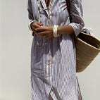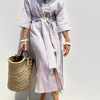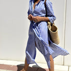 Entdecken Sie das klassische gestreifte Amélie-Kleid, das entworfen wurde, um Stil und Komfort bestens zu vereinen. Der lose Schnitt und die klassischen Akzente sorgen für eine schmeichelhafte Silhouette und gleichzeitig Bewegungsfreiheit. Perfekt für die Arbeit, ein Brunch oder einen entspannten Tagesausflug, bietet dieses Kleid tägliche Eleganz und Komfort. Es besteht aus einem hochwertigen, atmungsaktiven Stoff, der angenehm auf der Haut ist und leicht zu pflegen. Mit seinem klassischen Kragen und dem vielseitigen asymmetrischen Saum passt es zu jeder Tageszeit.