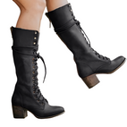Diese knielangen Schnürstiefel kombinieren modernes Design mit angenehmem Tragegefühl. Der robuste Blockabsatz sorgt für einen stabilen und bequemen Gang, während das hochwertige Material für eine lange Lebensdauer und ein elegantes Aussehen sorgt. Perfekt für den Alltag, das Büro oder entspannte Stadtbesuche. Ein Muss für alle, die Komfort mit Stil verbinden möchten.