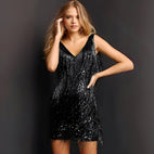 Ziehen Sie alle Blicke auf sich mit unserem schicken und stilvollen Cocktailkleid, das durch Fransen und Federn im Detail überzeugt.
